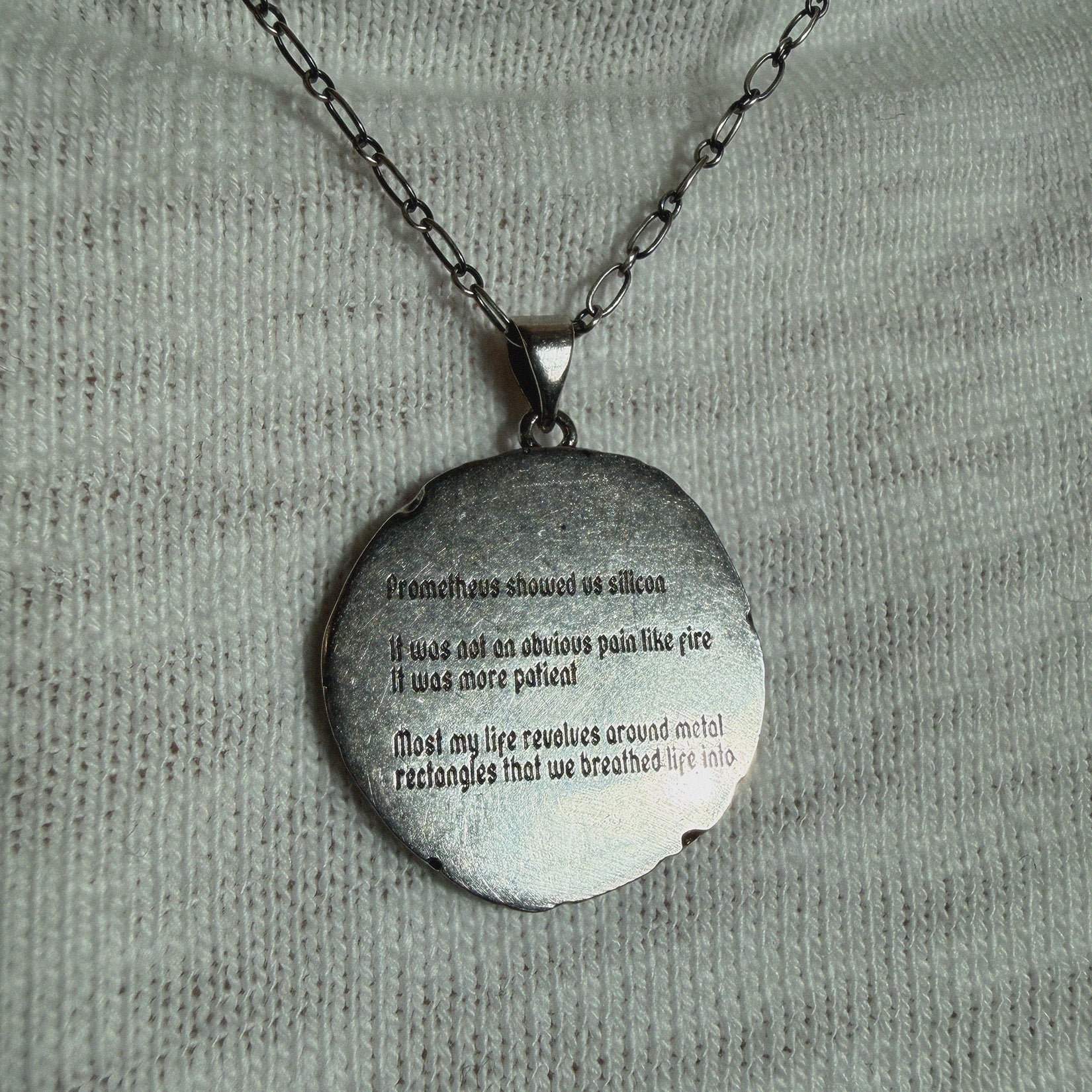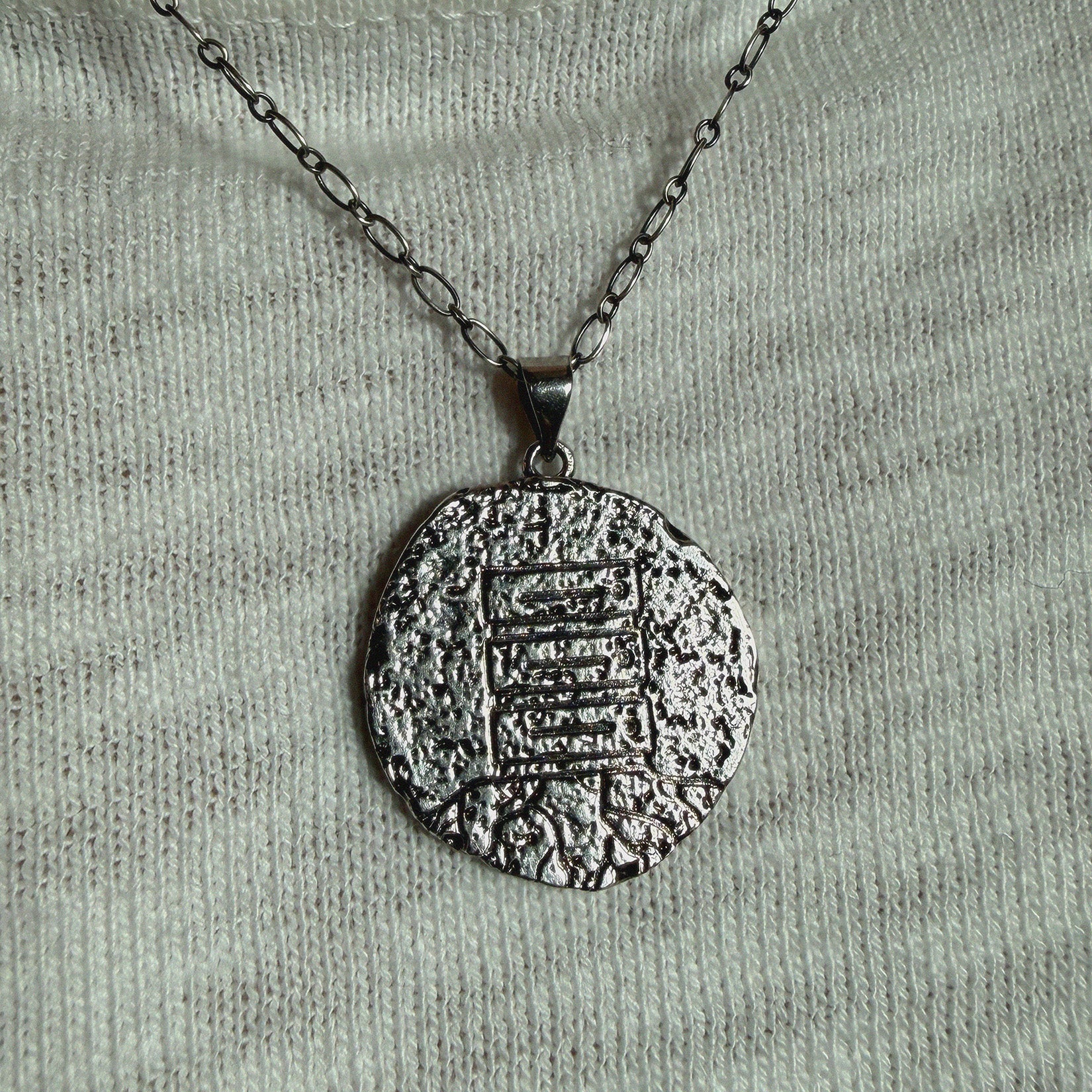 Out in the field buried in dirt this pendant was found. Inscribed it reads the following: